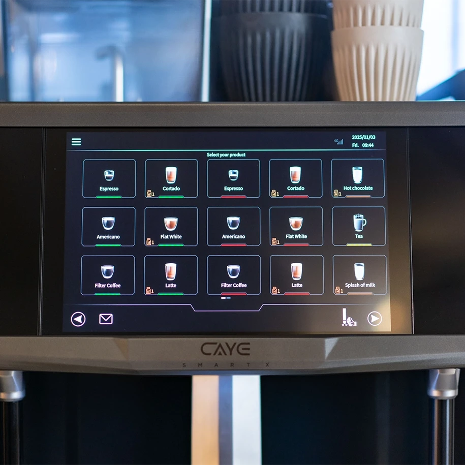 Caye Smart X er udstyret med en 10,1" touchskærm med et simpelt interface, der gør det nemt at navigerer i menuen og vælge den varme drik, som man ønsker - med et enkelt tryk.