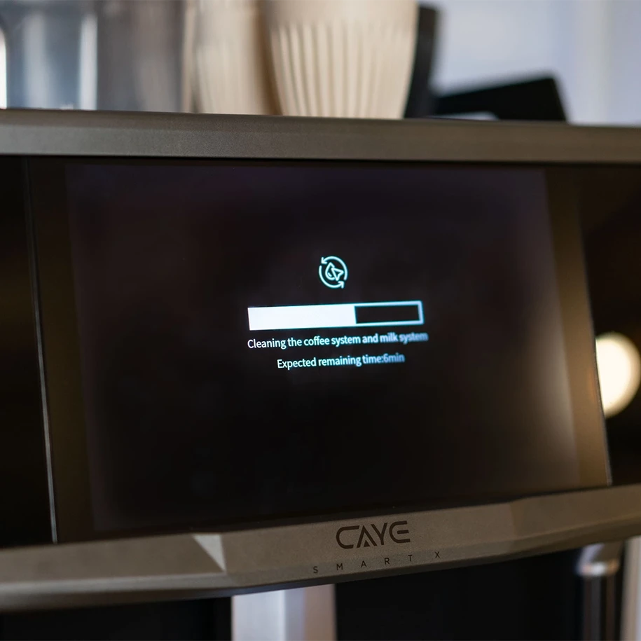 Caye Smart X har en automatisk rengøringscyklus, der både er mere grundigt og mere brugervenlig sammenlignet med andre fuldautomatiske maskiner. Alt du skal gøre er at sætte rengøringsprogrammet i gang og komme tilbage til en ren maskine efter et lille kvarter. Alternativt kan programmet også sættes i gang i slutningen af dagen, og man kommer tilbage til en ren maskine dagen efter.