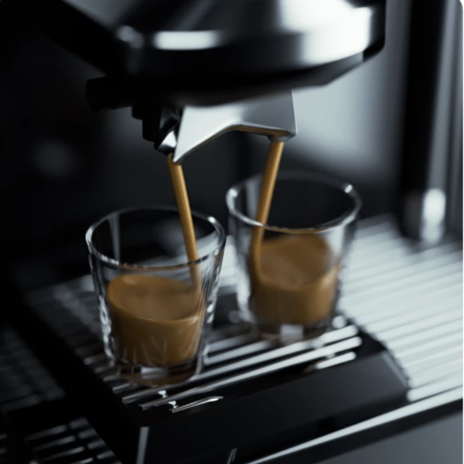- Mulighed for at få espresso i koppen og automatisk skummet mælk ved siden af i en kande, så man kan hælde flot latte art inden man serverer koppen.